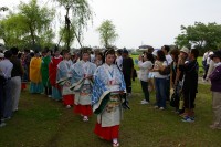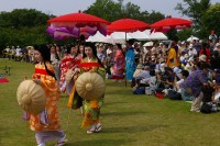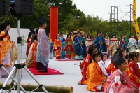 芝生広場の小高い所に斎王さまご一行がずらりと並ばれ緑の芝生に平安の衣装が(もちろん出演者本人も)よく合っていました。
